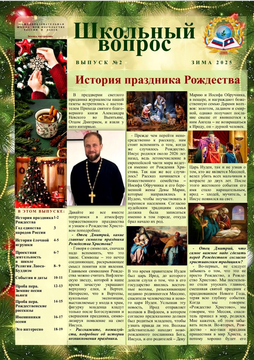 В этот раз ребята коснулись истории и традиций праздника Рождества, взяли интервью у настоятеля Прихода святого благоверного князя Александра Невского во Вьентьяне - Отца Дмитрия. В постоянной рубрике, посвященной стране пребывания, рассказали о Буддизме в Лаосе. Изучили историю елочной игрушки…