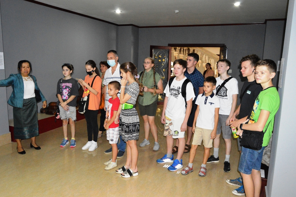 В нём мы посетили несколько залов, посвящённых различным историческим эпохам. Поразили нас редкие экспонаты палеонтологических раскопок - подлинные кости динозавра, антропологические артефакты останков человека, жившего приблизительно семь тысяч лет назад. Здесь хранятся древние предметы быта лаосцев, коллекция народных музыкальных инструментов. Неотъемлемой частью экспозиции являются фигурки Будды, созданные в разное время, в разной технике и из разных материалов. Некоторые экспонаты «говорят» о проникновении камбоджийской культуры.